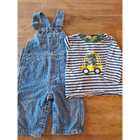 Set aus Latzhose aus weichem Jeansstoff in hellblau mit Baumwollfutterstoff von Baby GAP und blau/weiß gestreiftes Longsleeve mit Dino-Applikation ... mehr