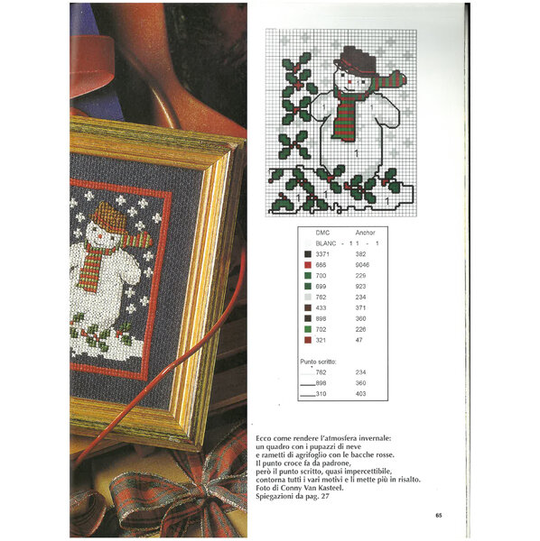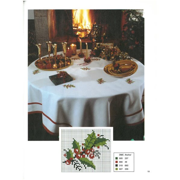 Hier sind viele Kreuzstich-Arbeiten rund um das Thema Weihnachten farbig abgebildet. Die Stickmuster und Farbcodes sind in Farbe oder schwarz-weiss zu sehen.