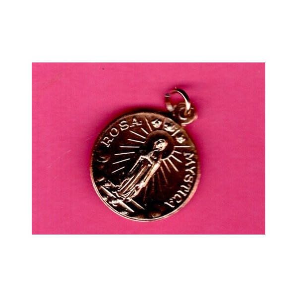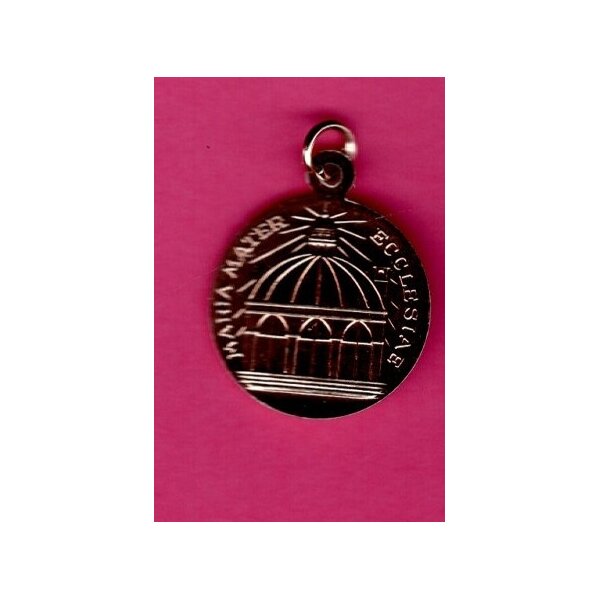 Goldfarbene Medaille aus Rom, Vorderseite: Madonna, Text: Rosa Mystica, Rückseite: Kirche, Text: Maria Mater Ecclesiae.
