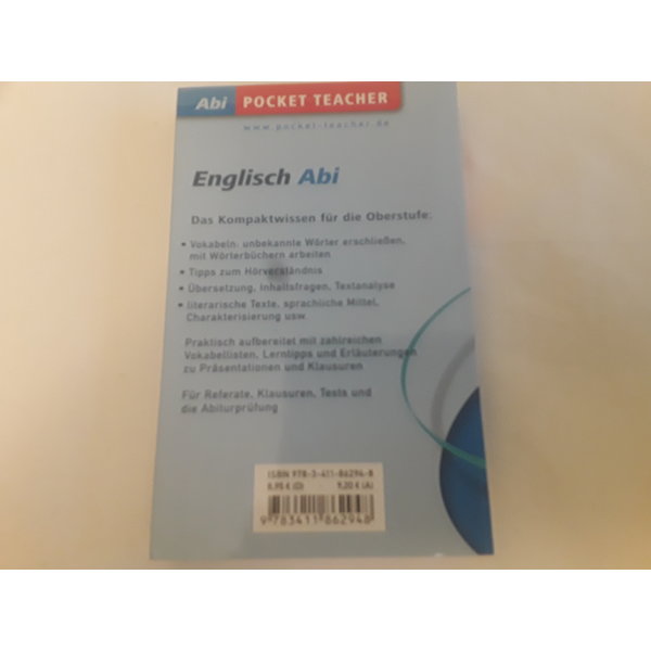 Die erfolgreichen "Pocket Teacher Abi" fassen alle lehrplanwichtigen Inhalte der Oberstufe kompakt und leicht verständlich zusammen. Der Band "Englisch" behandelt alles zum Thema Textarbeit: von Textverständnis und –analyse bis zum Verfassen eigener Texte. Präpositionen und unregelmäßige Verben werden in prägnanten Übersichten und Tabellen anschaulich dargestellt. Übersichtliche Vokabellisten am Ende jedes Kapitels unterstützen den Lernfortschritt. "Pocket Teacher Abi" sind die idealen Begleiter im Pocket-Format für Schüler der Oberstufe und helfen zuverlässig bei der Vorbereitung auf Klausuren, Tests und Referate sowie fürs Abitur. Der Lernstoff ist optimal gegliedert und leserfreundlich gestaltet. Zahlreiche Beispiele und Abbildungen stellen auch komplexe Zusammenhänge anschaulich dar. Ob Grundkurs, Leistungskurs oder direkte Abiturvorbereitung – hier profitiert jeder!