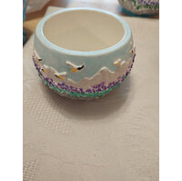 Sehr edle und teure Steingut Schale flach lila weiß Stiefmütterchen . War sehr teuer! Leider am Rand ein abplatzer . Ca 20cm lang ... mehr