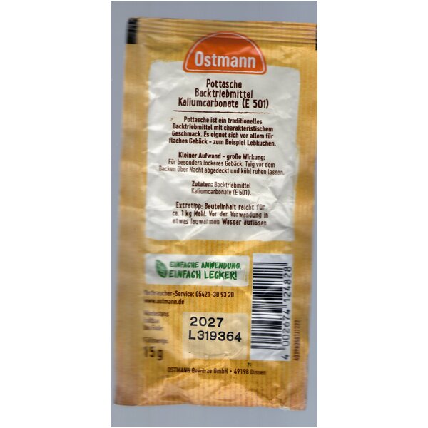 Ostmann Pottasche wird als Backtriebmittel mit charakteristischem Geschmack speziell zur Lockerung von solchen Teigen eingesetzt, die einen hohen Zuckergehalt haben und als Flachgebäck verarbeitet werden (z. B. Honigkuchenteige). Diese Teigarten lässt man gerne einige Stunden oder Tage ruhen (kühl und zugedeckt), da die Pottasche in dieser Zeit die typische Lockerung des Teiges bewirkt.