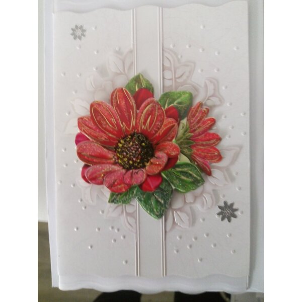 Grußkarte Pergament mit Prägedruck und roten Blumen #170 - Diese Karte ist aufwändig mit Pergament-Papier, Kartenausschnitt mit Prägedruck und einem Karteneinschub gestaltet. Sie besteht aus verschiedenen Schichten: Karte, Pergamentpapier und Innenblatt zum Beschreiben. Das Pergamentpapier ist am oberen und unteren Rand in Wellenform geschnitten genau wie die Karte, die verschiedenen Teilen sind in unterschiedlichen Größen. Diese edle Karte habe ich mit einem 3 D-Blumenmotiv beklebt, dieses Motiv sind 2 große rote Blüten (Gerbera?) und in der linken obere und rechten unteren Ecke habe ich 2 kleine silberne Blüten aufgeklebt - aber auch bei dieser aufwändig gestalteten Blumen-Karte habe ich bewusst auf eine Aufschrift verzichtet. Die Karte kann für viele Gelegenheiten genutzt werden und auf dem Innenblatt beschriftet werden. Für den Versand ist ein weißer Umschlag dabei aber ich verzichte bei den Karten überwiegend auf Einzelverpackung mit Folie - schütze jedoch für den Transport alle Artikel, die ich verschicke mit einem Beutel (dieser kann weiter verwendet werden und ist damit nachhaltiger als eine Einzelverpackung).