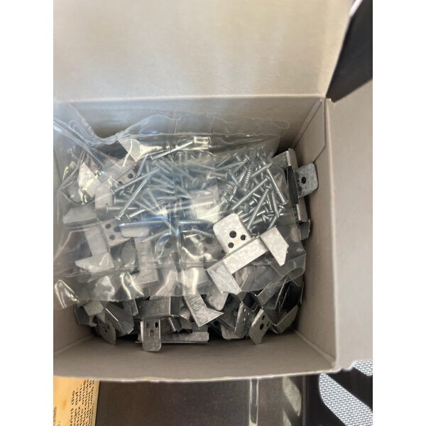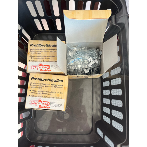 ES handelt sich um Profilbrettkrallen zur Fixierung von Deckenvertäfelungen in Nut und Feder. Die Krallen wurden mit an der Holzkonstruktion (Latte) und dem Profilbrett verbunden.