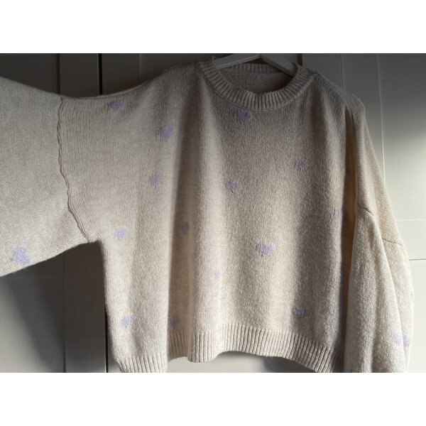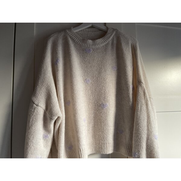 Toller Pulli, mit kleinen lila Herzen, im Oversize Look, kein Grössenschild vorhanden, wurde bei Gr. 40 getragen, er ist aber oversized, also eher weit geschnitten, das soll so sein :)