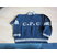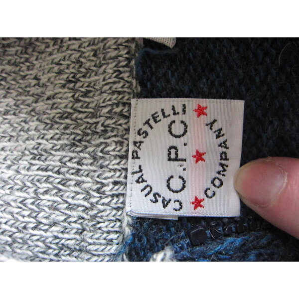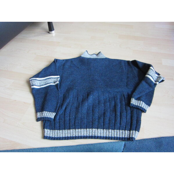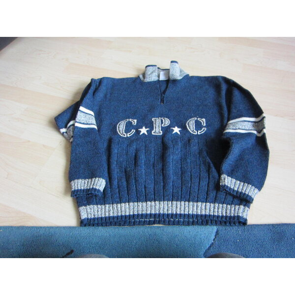 Pullover in Strickoptik in blau mit grauen Streifen und grauen Aufnähern. Der Kragen ist grau und am Bund der Ärmel und des Pullover ist ein grauer Streifen. Auf den Ärmeln dazu in der Mitte noch drei Streifen, weiß, grau und weiß. Die Aufnäher vorne C:P:C. mit Sternen dazwischen in weiß.