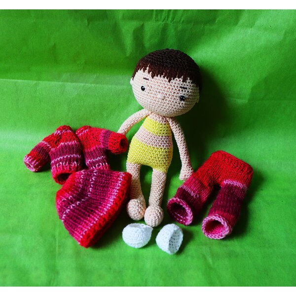 Die Jacke, Hose, Mütze und Schuhe können ausgezogen werden. Sie sind gestrickt.
