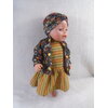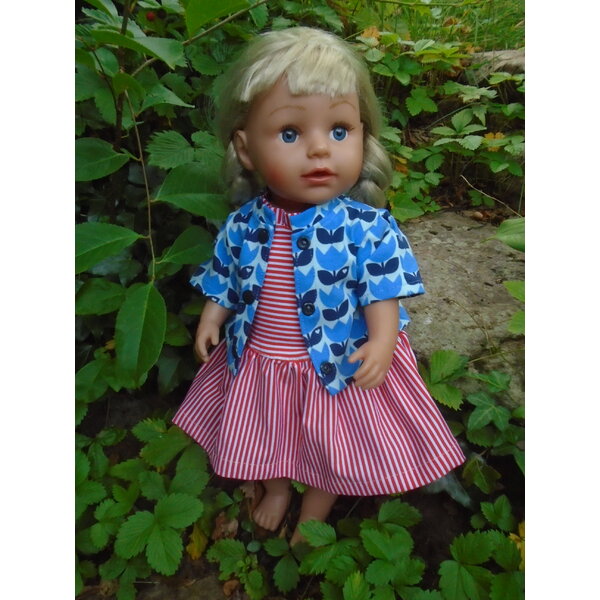 Gestreiftes Puppenkleid mit geblümter Jacke.