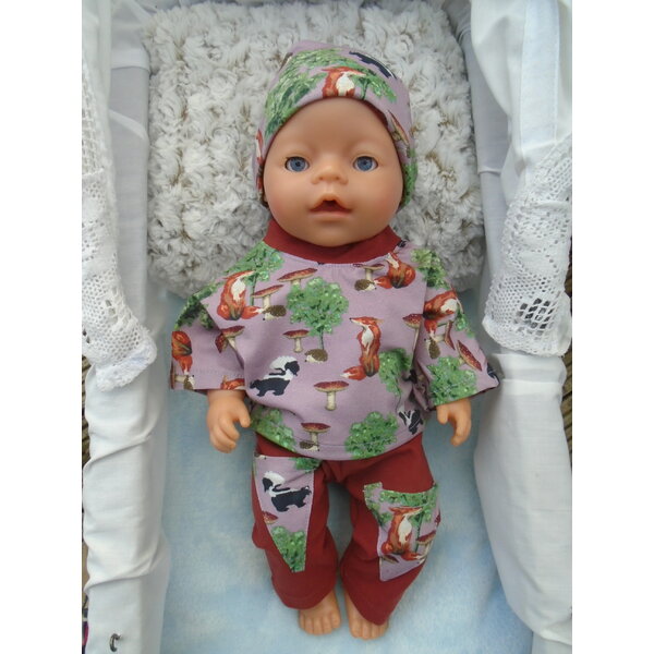 Hose mit Beintaschen, Pulli mit Waldtieren bedruckt, Wende- Beanie und Umhängetasche.