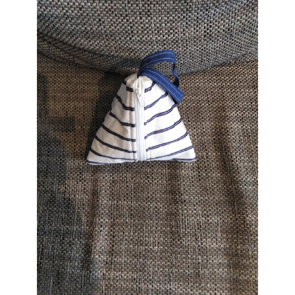 Pyramidentasche mit blauen Streifen. Vermittelt einen Maritimen Eindruck. Sie wurde mit festem Stoff genäht und mit Volumenvlies verstärkt