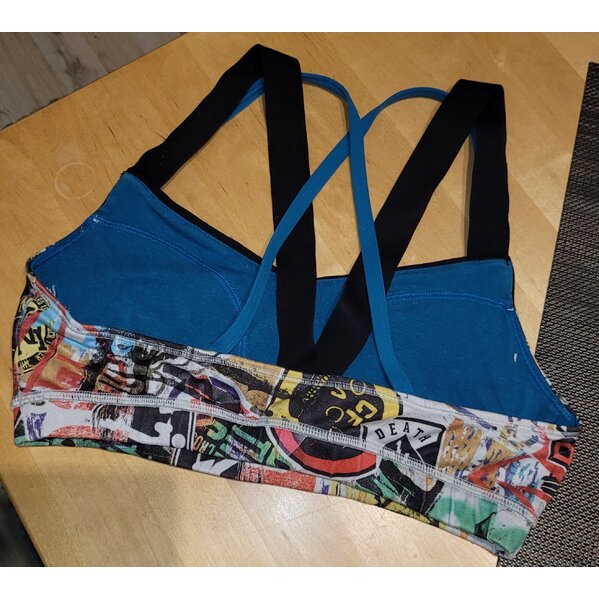 Reebok Cross Fit Sport-BH in der Gr. XS, ca. 65/70 AB, mehrfarbig, ohne Pads (können aber eingelegt werden), elastisches Unterbrustband, überkreuzte Doppelträger (breite und dünne) nicht verstellbar - Material: schätze Polyester & Elasthan, kein Pflegeschild mehr vorhanden