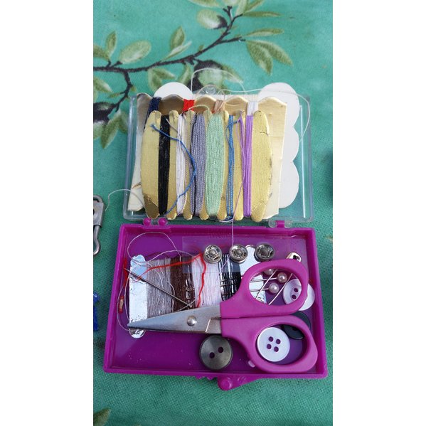 Plastikdose mit Nadel Schere etc. Habe noch versch Farben Garn dazu.