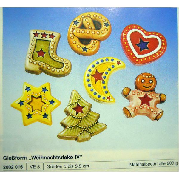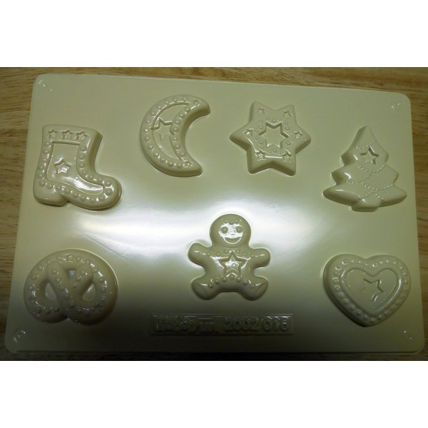 Gießform mit 7 weihnachtlichen Motiven - bei 6 der Motive kann man 2 gleiche Teile zusammenkleben (3 D)