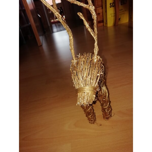 Rentier oder Hirsch, goldfarben, aus Stroh, als Weihnachtsdekoration, 24 cm lang, samt Geweih 37 cm hoch.
