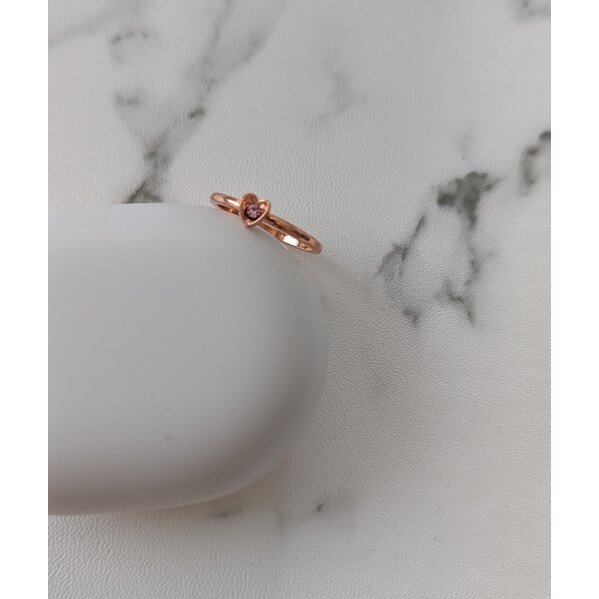 Rosegoldfarbener Ring mit einem süßen Herzen, der kit einem rosafarbenen Schmuckstein geschmückt ist.