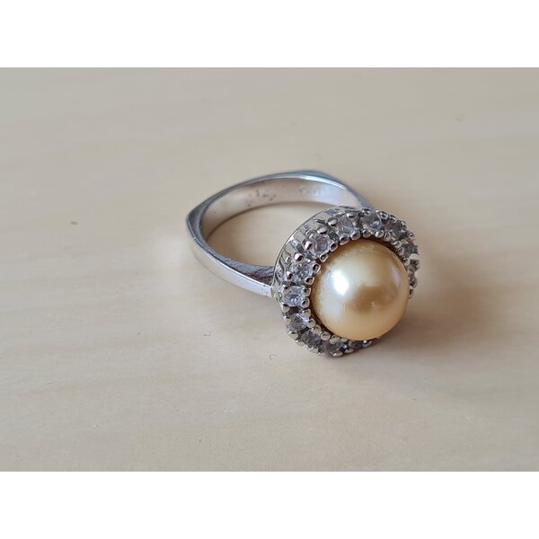 Ring Silber mit Perle und Zirkonia. Größe 53. Breite 1,5 cm. Gestempelt mit 800.