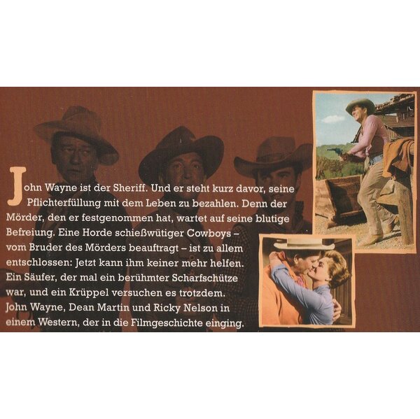 John T.Chance ist der Sheriff. Er steht kurz davor, seine Pflichterfüllung mit dem Leben zu bezahlen. Denn der Mörder, den er festgenommen hat, wartet auf seine blutige Befreiung. Eine Horde schießwütiger Cowboys - vom Bruder beauftragt - ist zu allem entschlossen: Jetzt kann ihm keiner mehr helfen. Ein Säufer, der mal ein berühmter Scharfschütze war, und ein Krüppel versuchen es trotzdem.