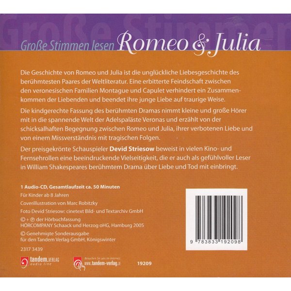 Die kindgerechte Fassung von Barbara Kindermann entführt die kleinen Leser in die prachtvollen Adelspaläste Veronas, wo die beiden Familien Capulet und Montague in erbitterter Feindschaft leben. Spannungsreich, leicht verständlich und einfühlsam zugleich wird von der schicksalhaften Begegnung zwischen Romeo und Julia erzählt.