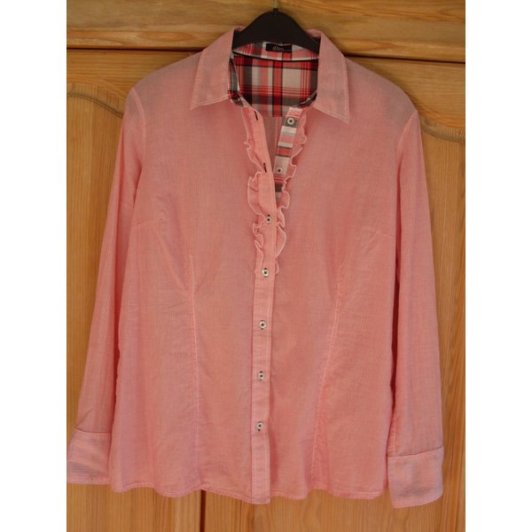 Ausgefallene rotweiß-gestreifte Bluse mit kleiner Rüsche am Ausschnitt und Karomuster in der Knopfleiste. Pflegeleicht und super angenehm zu tragen.