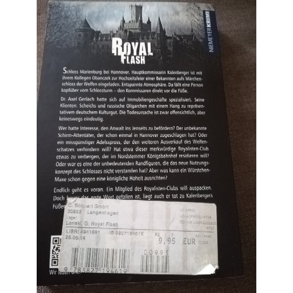 Schloss Marienburg bei Hannover. Hauptkommissarin Kalenberger ist mit ihrem Kollegen Obanczek zur Hochzeitsfeier einer Bekannten aufs Märchenschloss der Welfen eingeladen. Entspannte Atmosphäre. Da fällt eine Person kopfüber vom Schlossturm, den Kommissaren direkt vor die Füße. Dr. Axel Gerlach hatte sich auf Immobiliengeschäfte spezialisiert. Seine Klienten :Scheichs und russische Oligarchen mit einem Hang zu repräsentativen deutschen Kulturgut. Die Todesursache ist zwar offensichtlich, aber keineswegs eindeutig. Wer hatte Interesse, den Anwalt ins Jenseits zu befördern? Der unbekannte Schirm-Attentäter, der schon einmal in Hannover zugeschlagen hat. Oder ein missgünstiger Adelsspross, der den weiteren Ausverkauf des Welfenschatzes verhindern will? Hat etwa dieser Merkwürdige Royalisten-Club etwas zu verbergen, der im Nordstemmer Königsbahnhof residieren will? Oder war es eine der unbedeutenden Randfiguren, die das neue Nutzungskonzept des Schlosses nicht verstanden hat? Aber was kann ein Würdtchen-Maxe schon gegen eine königliche Hoheit ausrichten?