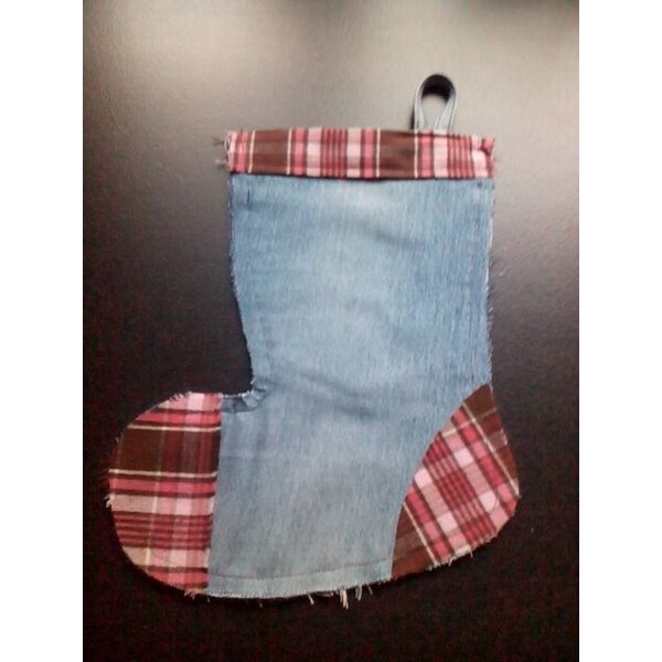 Dieser Nikolausstiefel ist im Ragtime-Stil aus einer alten Jeanshose und Hemdenflanell genäht. Die Vorderseite hat eine aufgenähte Tasche von der Jeanshose, und Spitze, Hacke und Bund sind mit Flanellstoff genäht. Die nach aussen offenen Nähte und der etwas ausgefranste Stoff sind die Merkmale des Ragtime Stils. Der Stiefel ist 33 cm hoch. Die kleine Schlaufe zum Aufhängen ist ca. 6 cm lang.