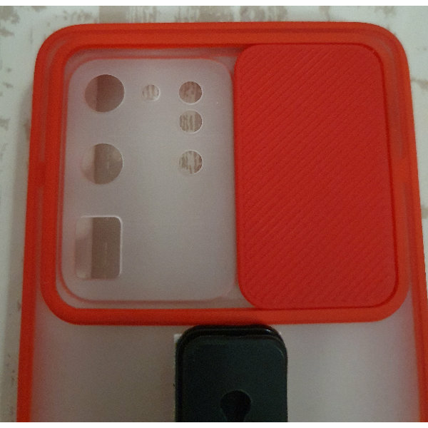 Samsung S20 Ultra Hülle Rand Rot hinten milchig mit verschiebbarem Kameraschutz und selbstgeklebter Fingerschlaufe (kann man wieder abmachen)