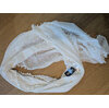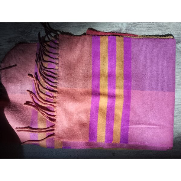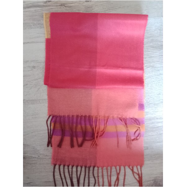 Ist 100% Acryl, fühlt sich aber wie Kaschmir an. Farbe ist orange, gelb, rosa, pink. Alles eher gedeckte Farben.
