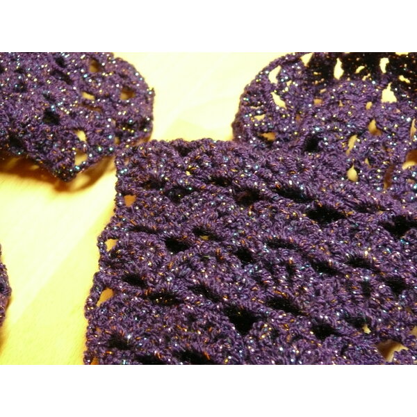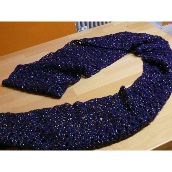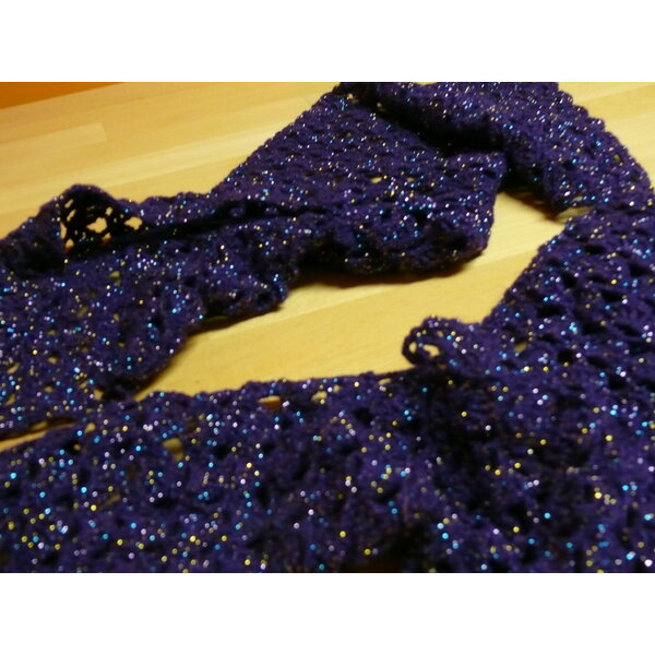Ein sehr schöner, eleganter, selbstgehäkelter Schal. Ein warmes Lila mit Metallfaden in türkis und rosa.