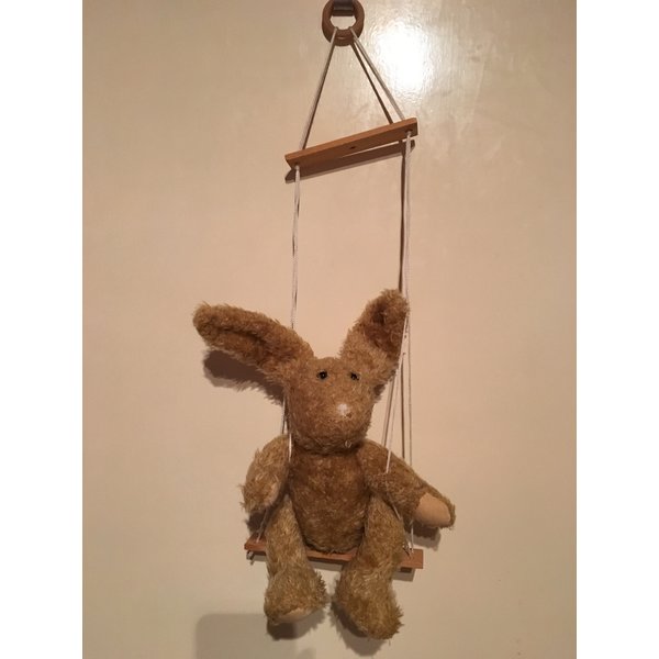 Länge 47 cm / Sitzfläche aus Holz innen 14 cm, insg. Länge 17 cm. 1 Schaukel für Bären oder Puppen, Dekoration. Mit Aufhänger, Ohne abgebildeten Hasen