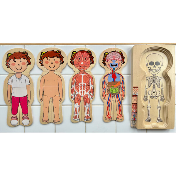 Interessantes Holzpuzzle aus fünf Schichten zum Kennenlernen des menschlichen Körpers. Die einzelnen Schichten werden übereinander gepuzzelt. Ganz unten: Skelett, darauf: Organe und Blutgefäße, darauf: Muskulatur, darauf: Kind ohne Kleidung, darauf: Kind mit Kleidung.