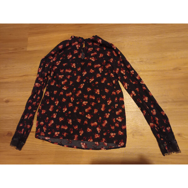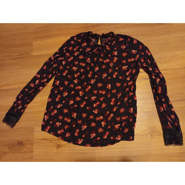 Hübsche Bluse, große 34 von Orsay. Schwarz mit rot-rosa Rosenmuster. Die Ärmel sind zierlich mit schwarzer Spitze besetzt.
