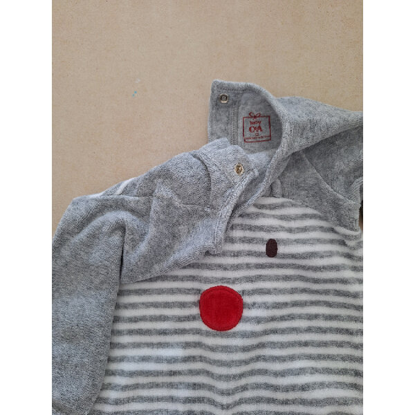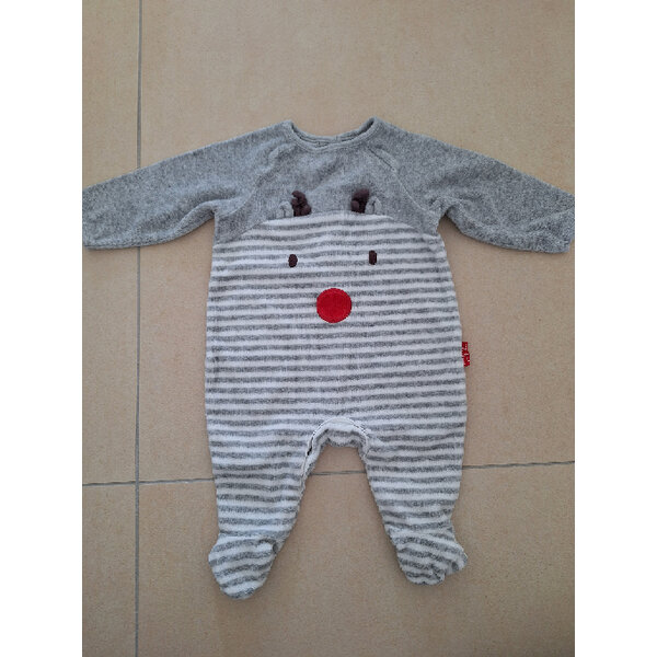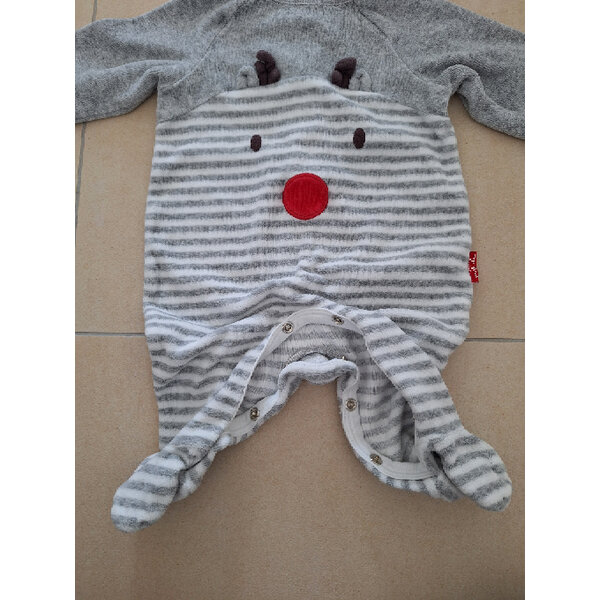 Dicker Schlafanzug aus Nicki/Fleece-Stoff in Grau mit Rentier-Gesicht und Ohren. Der Schlafanzug hat eine Knopfleiste auf dem Rücken zum leichten Aus- und Anziehen und eine zusätzliche Knopfleiste zum schnellen Windel wechseln.