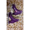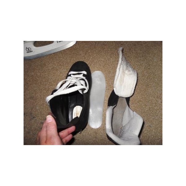 Die Schlittschuhe sind jeweils 3-teilig - ein Außenschuh, eine Plastiksohle, ein Innenschuh mit scheinbar handgenähten Nähten, wie eine Art Hüttenschuh, zum Herausnehmen. Auf dem Futter innen befinden sich schon einige Knötchen (Pilling). Da die Schuhe jetzt einige Jahre nicht benützt wurden, wäre es vielleicht sinnvoll, sie etwas anzuschleifen. Es geht aber sicher auch so, wenn die Schuhe nicht zu Profizwecken verwendet werden sollen.
