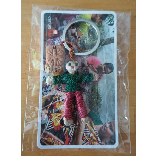 Schlüsselanhänger mit Männchen und Emblem aus Ton. Ca. 8,5 cm lang (inkl. Ring).