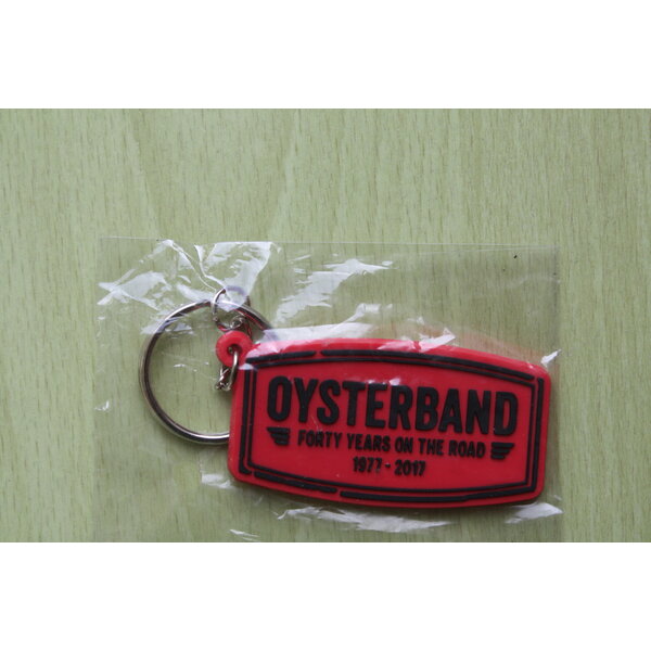 Schlüsselanhänger aus biegsamem Material, vermutlich Gummi, mit Aufdruck: Oysterband – Forty Years on the Road – 1977-2017