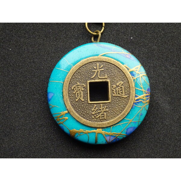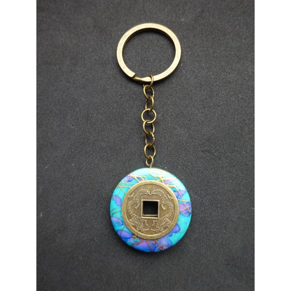 Schlüsselanhänger mit chinesischen Münzen. Der Anhänger wurde beidseitig gearbeitet; eine Seite der Münze zeigt zwei Drachen (s. 1. u. 2. Foto), die andere Seite chinesische Schriftzeichen (s. 3. Foto).
