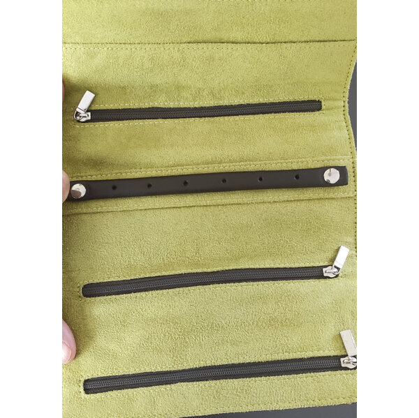 Hübsches Schmucketui, gut für die Reise geeignet. Drei kleinere Fächer, RingAufbewahrung, großes Steckfach.