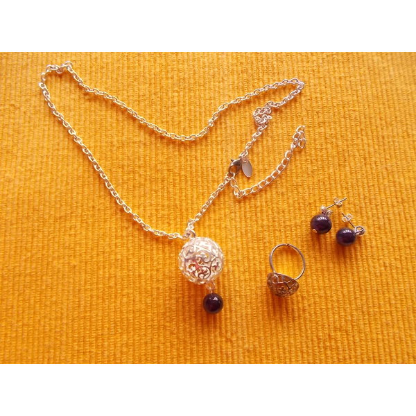 Dieses Schmuckset mit 3 Amethyst-Steinchen besteht aus einer Kette, 2 Ohrsteckern und einem Ring. Sieht sehr schick aus und passt zu vielen Gelegenheiten.