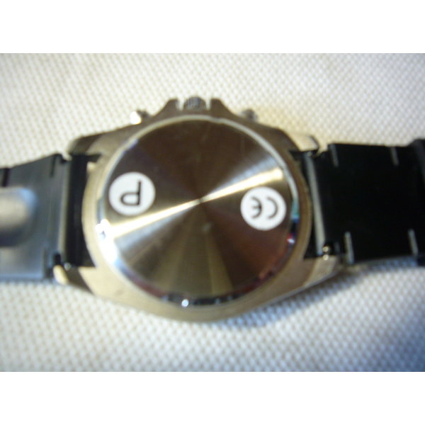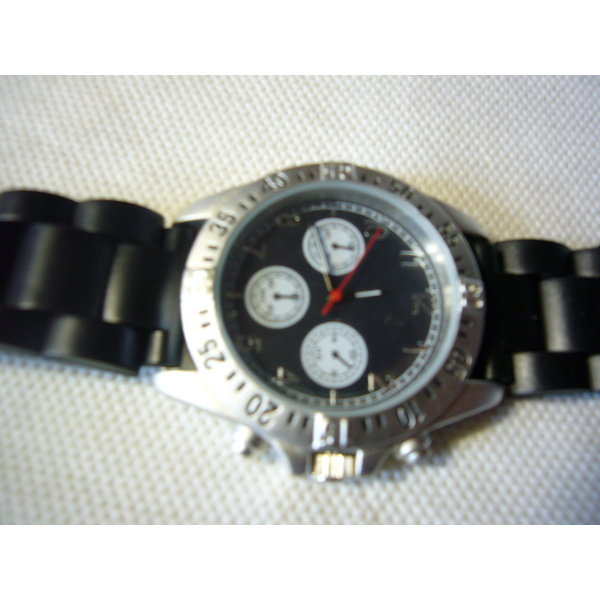 Ideales Geschenk: sehr schöne Herrenarmbanduhr mit schwarzem Zifferblatt silbernen Zahlen. Gesamtdurchmesser des Zifferblattes ist 4 cm. Kunststoff Armmband. Vermutlich integrierte Stoppuhr. Liegt schon seid Monaten im Schrank, daher ist die Batterie leer, kann also nichts näheres dazu sagen.