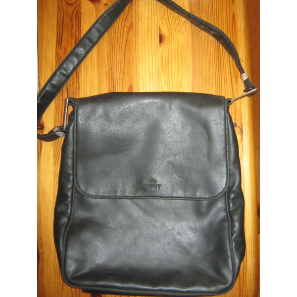 Die Schwarze Tasche von Esprit besteht aus einem weichen Leder (Kunstleder wahrscheinlich). Sie wurde gerne getragen, aber NICHT täglich (z.B.zur Arbeit). Wird über große Lasche mit Druckknopf verschlossen. Es gibt zwei  große Fächer, die quasi nur durch die Klappe verschlossen sind. Das größere Fach hat noch eine Innentasche, die mit Reissverschluß geschlossen wird .
