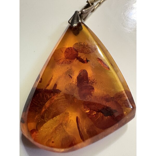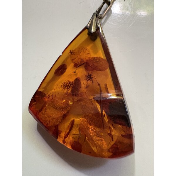 Biete einen schönen Bernsteinanhänger für eine Kette. Die Form ist etwa dreieckig, Höhe ca. 4cm, Breite unten ca. 3cm. Sehr schöne Einschlüsse siehe Fotos.