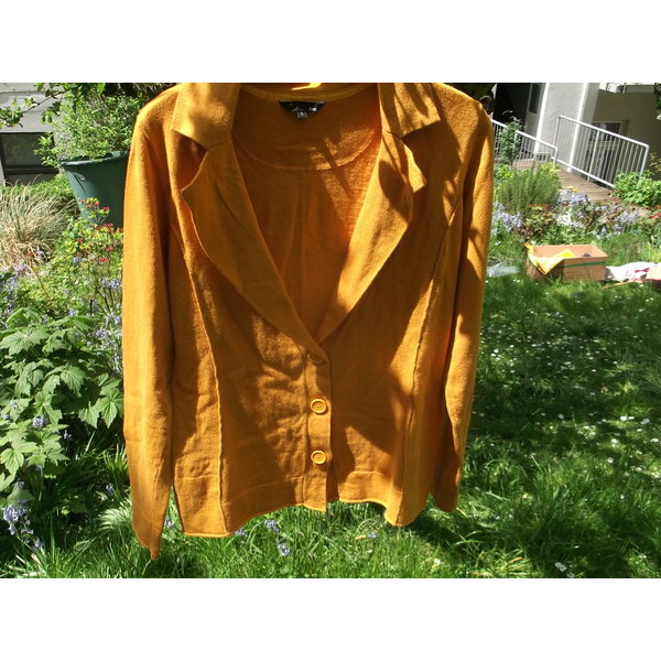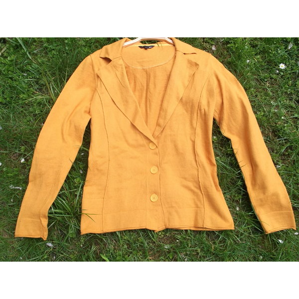 Ein toller Blazer in warmem, sonnigem Gelb. Aus ganz weichem Material: 95% Baumwolle, 5% Cashmere. Der Cashmere-Anteil ist deutlich fühlbar,eine wunderbar weiche und angenehme Qualität. Schöner, femininer Schnitt. Perfekt für alle Jahreszeiten. Ein potentielles Lieblings-Teil!!