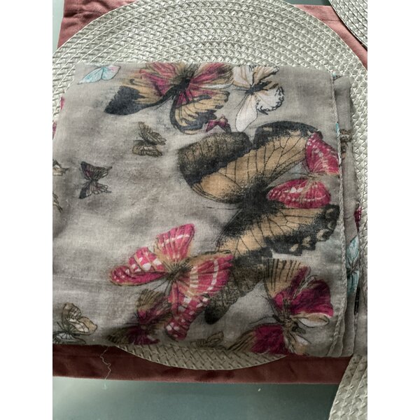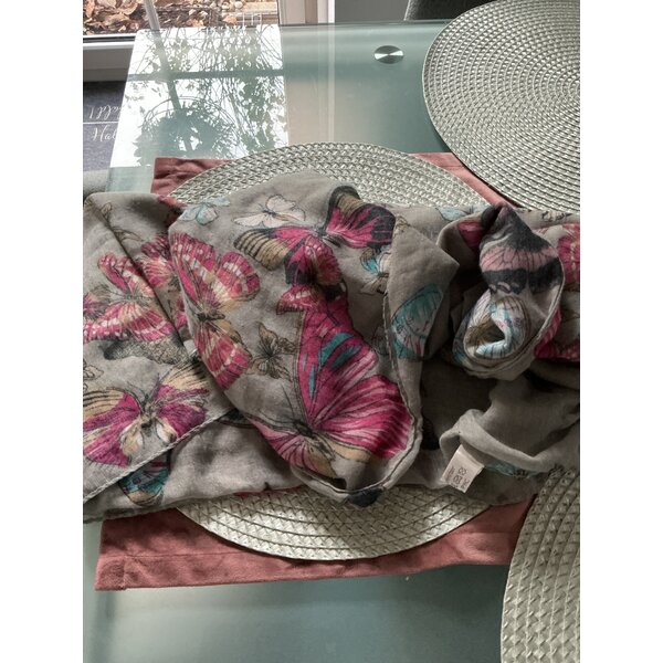 Schönes Tuch mit verschiedenen farbigen Schmetterlingen auf grauem Grund