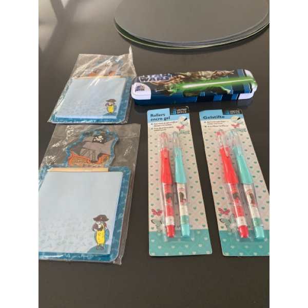2 Notizblöcke Pirat, 2 Packungen je 2 Gelstifte Motiv Pferde, 1 Metalstiftebox Star Wars
