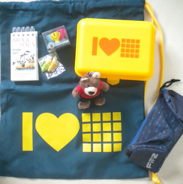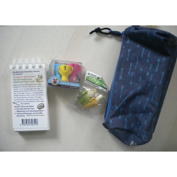 Dazu gibts noch Radiergummis, ein Schlampermäppchen der Marke FIT-Z und ein kleines Kinder Brockhaus Quiz Büchlein.