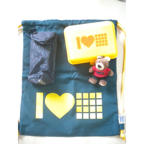 Der Turnbeutel , die gelbe Versperdose und das kleine Bärchen sind mit dem Ritter Sport Logo versehen.