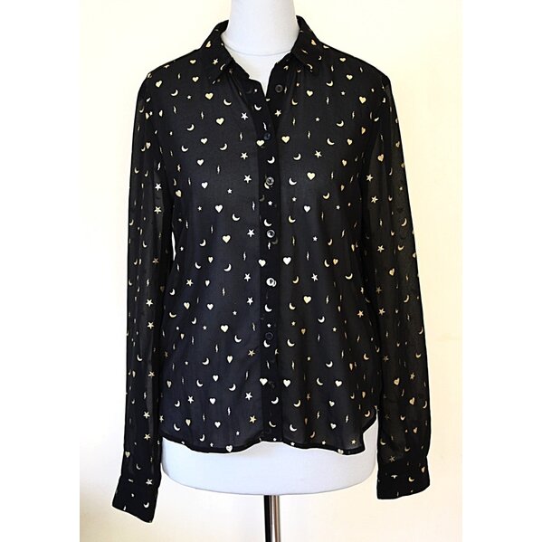 Schöne, durchsichtige Bluse mit langen Ärmeln, klassischem Kragen und durchgängiger Knopfleiste. Die Bluse ist mit unzähligen kleinen, goldenen Motiven verziert - Herzen, Mondsicheln, Sterne und Blitze. Sie ist locker geschnitten und mit Gr.XS ausgewiesen - sie passt super mit Gr.34 und Gr.36.