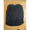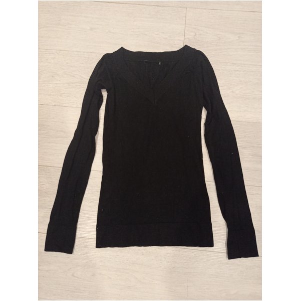 Dieser schöne Pullover ist eng geschnitten aber dehnbar. Es ist aus Feinstrick aus einer Kunstfasermischung. Der Ausschnitt ist spitz.
