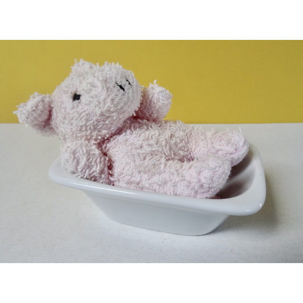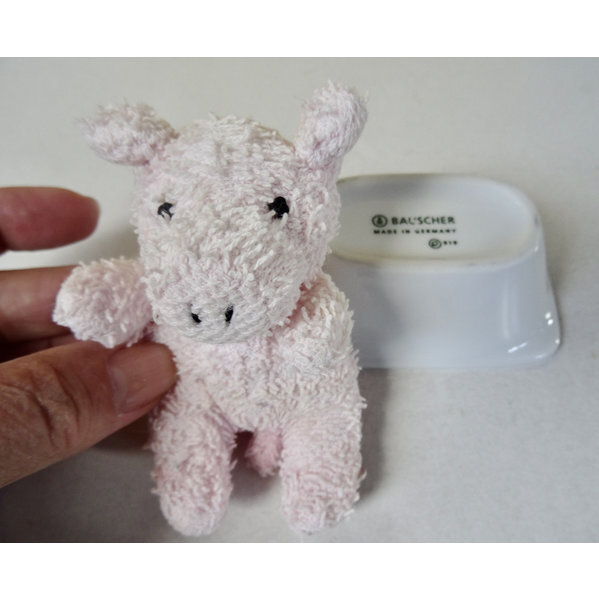 Niedliches Ferkel und eine Puppen-Badewanne aus Porzellan.