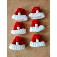 Sechs hübsche kleine, selbst gehäkelte Mützchen mit einer kleinen Holzkugel als Bommel.